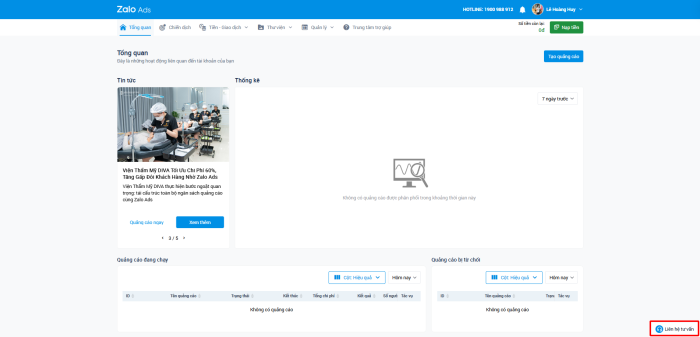 Nhà quảng cáo có thể gửi thông tin yêu cầu hỗ trợ qua form Liên hệ ở góc phải dưới màn hình
