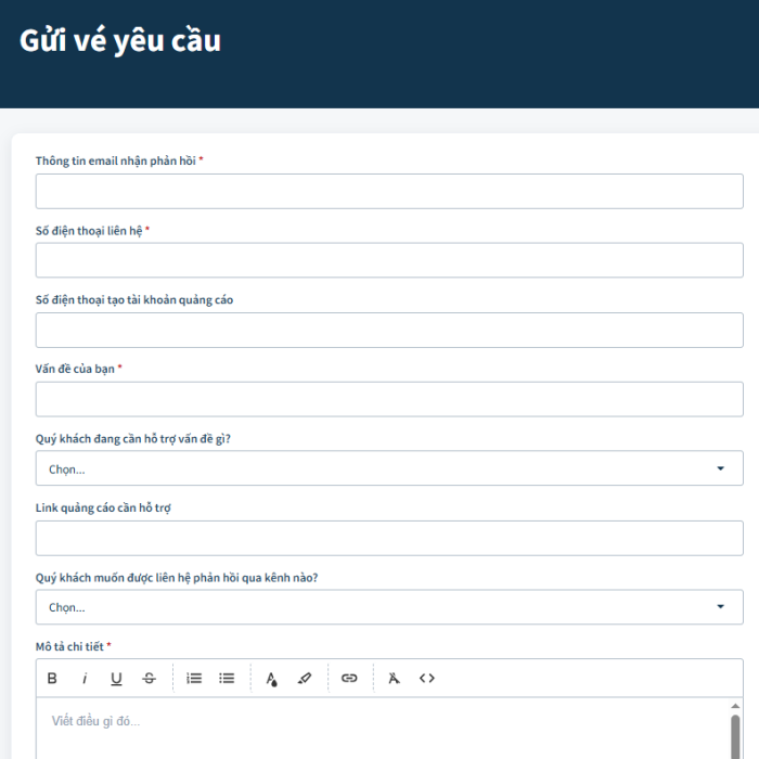 - Nội dung: Cung cấp thông tin mô tả về yêu cầu hỗ trợ của nhà quảng cáo, đường link chiến dịch quảng cáo cần hỗ trợ. Đính kèm hình ảnh liên quan đến vấn đề cần hỗ trợ.