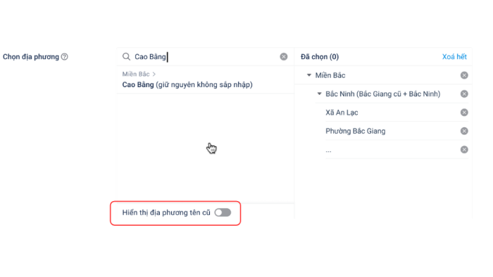 - Với các quảng cáo đang sử dụng nhóm đối tượng theo địa giới cũ, hệ thống sẽ hiển thị thông báo và hỗ trợ cập nhật nhanh.