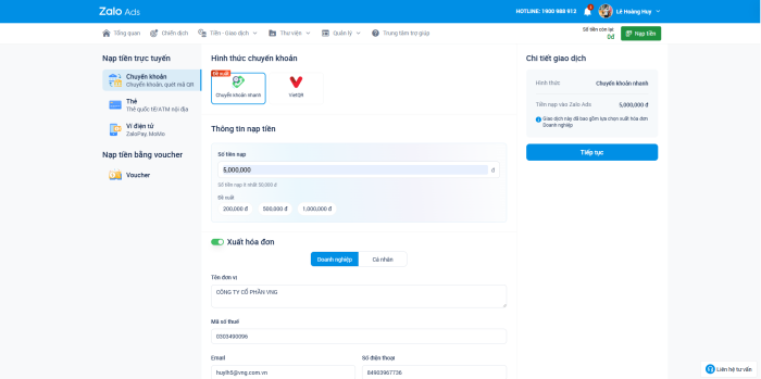 Nếu nhà quảng cáo muốn xuất hóa đơn cho số tiền chuyển khoản, nhà quảng cáo vui lòng chọn Xuất hóa đơn và cập nhật đầy đủ thông tin xuất hóa đơn.