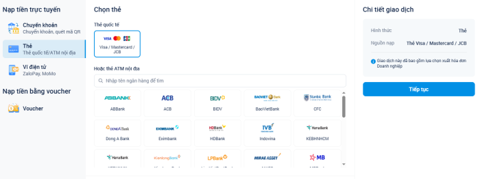 - Nạp tiền trực tuyến qua thẻ thanh toán quốc tế Visa/Master/JCB