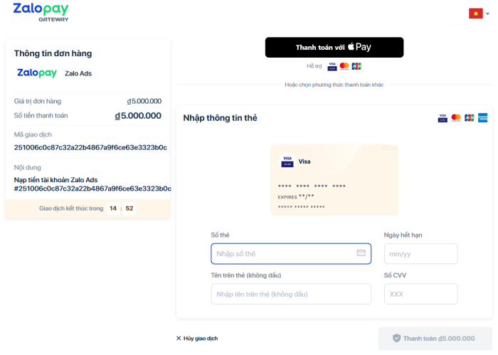 Zalo Ads hỗ trợ nhà quảng cáo nạp tiền trực tuyến qua cổng thanh toán (gateway) của Zalopay. Nhà quảng cáo có thể nạp tiền trực tuyến theo các loại sau:
