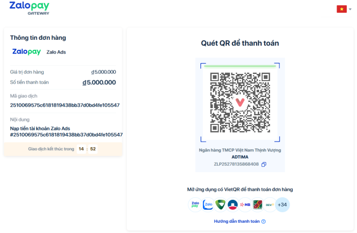 Nếu nhà quảng cáo chọn hình thức nạp tiền qua ví ZaloPay, hoặc ví điện tử MoMo, nhà quảng cáo mở app ZaloPay (hoặc app MoMo) để quét mã và thực hiện giao dịch.