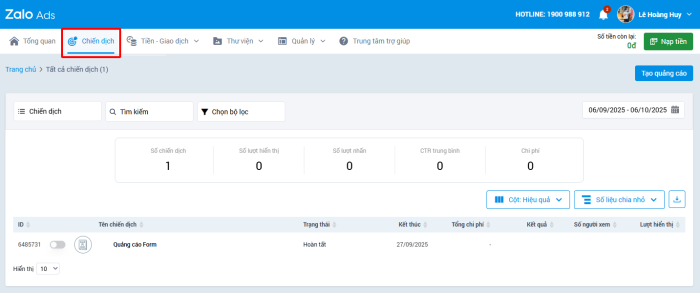 Tại Trang chủ, nhà quảng cáo nhấn vào tab Chiến dịch.