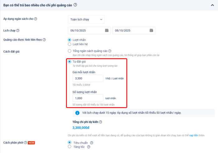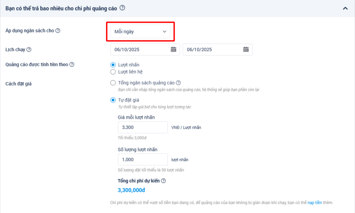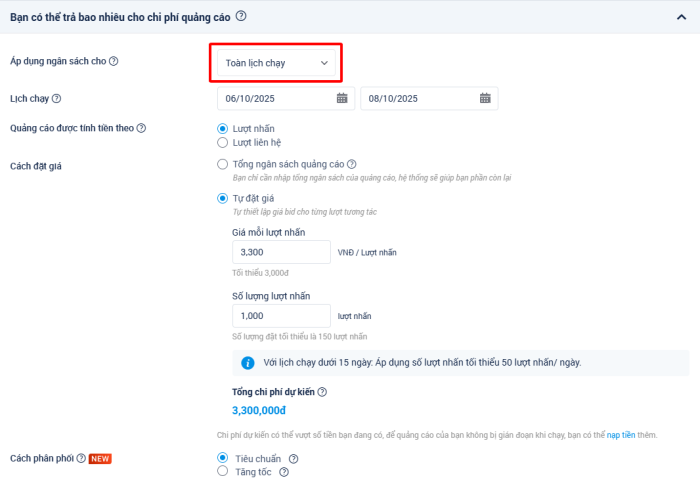 Khi tạo quảng cáo trên Zalo, nhà quảng cáo sẽ lựa chọn số lượng mong muốn đạt được và hình thức quảng cáo theo toàn chiến dịch hoặc theo ngày.