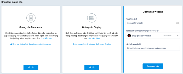 Bước 1: Nhà quảng cáo chọn loại quảng cáo (như điều kiện trên) và nhấn nút Tạo quảng cáo.