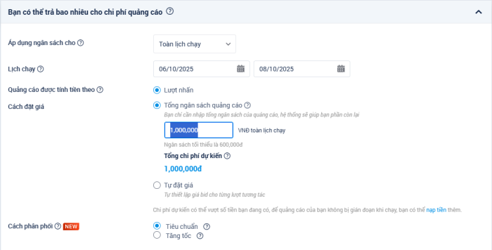 Bước 2: Nhà quảng cáo chọn cách đặt giá theo Tổng ngân sách quảng cáo tại phần Bạn có thể trả bao nhiêu chi phí cho quảng cáo này?