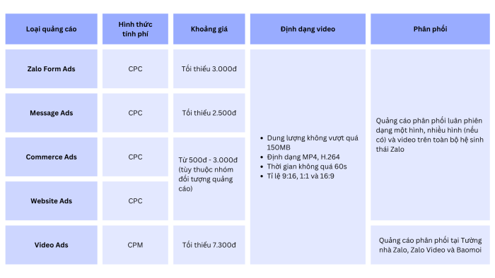 Hiện tại, quảng cáo hiển thị video áp dụng loại hình quảng cáo sau: Quảng cáo Form, Quảng cáo Commerce, Quảng cáo Website, Quảng cáo Video, Quảng cáo Tin nhắn (có chọn Zalo OA).
