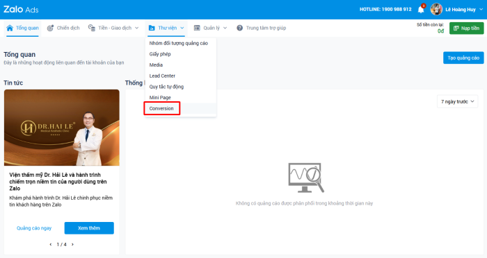 Để theo dõi báo cáo Zalo Ads pixel, nhà quảng cáo chọn Thư viện sau đó chọn Conversion. Nhà quảng cáo có thể xem được danh sách conversion của mình và các số liệu liên quan.