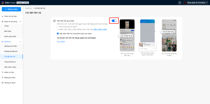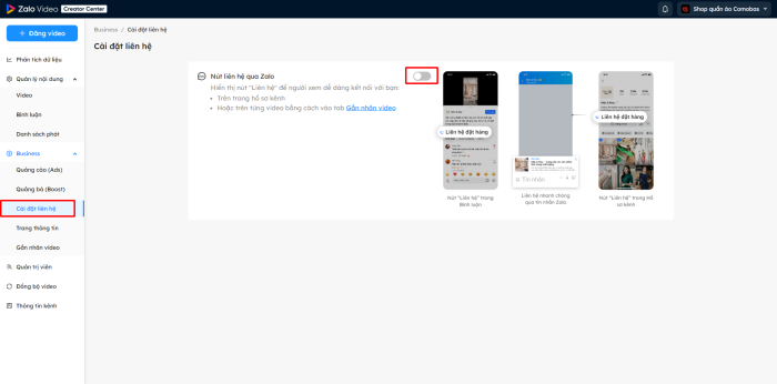 - Khi không còn nhu cầu sử dụng tính năng, nhà sáng tạo chọn mục “Cài đặt liên hệ” và tắt tính năng “Nút liên hệ qua Zalo”.