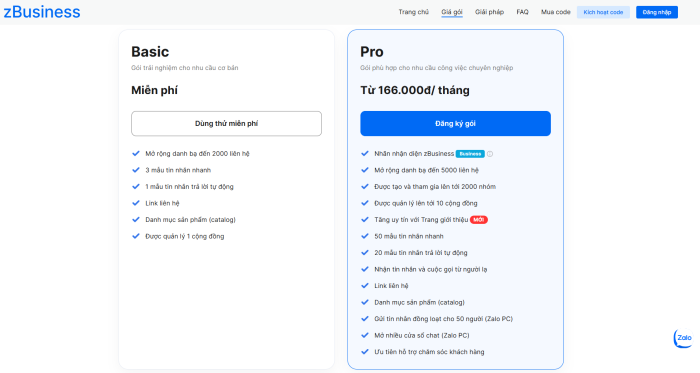- Chọn gói zBusiness Cơ bản hoặc Pro và tiến hành đăng ký