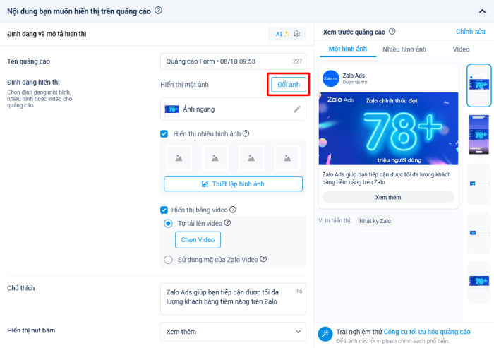 Trong phần thiết lập hình ảnh quảng cáo tại mục “Nội dung bạn muốn hiển thị trên quảng cáo“, nhà quảng cáo chọn mục Hiển thị một ảnh, chọn Đổi ảnh.