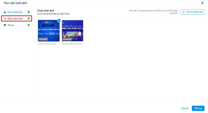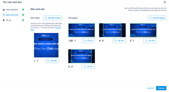 Tại mục Điều chỉnh ảnh, nhà quảng cáo nhấn chọn Đổi ảnh vuông => Chọn hình ảnh vuông có dung lượng không quá 2MB.