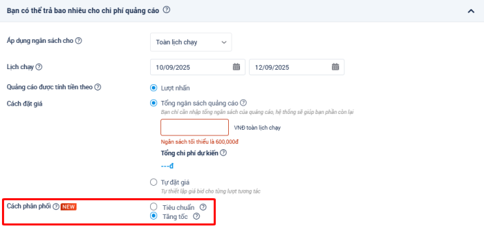 - Trong trường hợp lịch chạy quảng cáo thiết lập thời gian chạy 1 ngày và đã kết thúc, sau đó nhà quảng cáo chỉnh sửa thêm thời gian chạy ít nhất 1 ngày và không thay đổi ngày bắt đầu → Lịch chạy được lưu là 2 ngày trở lên → Phương thức “Cách phân phối” sẽ được hiển thị.