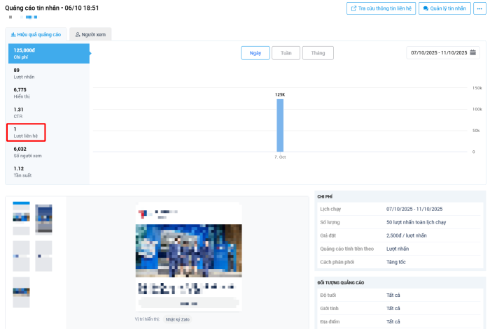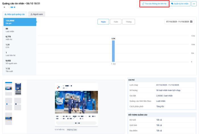 Với nút bấm Tra cứu thông tin liên hệ, nhà quảng cáo sẽ được dẫn đến trang quản lý Chatbot trên Zalo OA đang lựa chọn để quảng cáo (phần Người dùng).