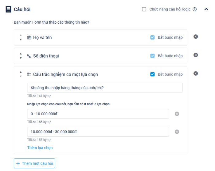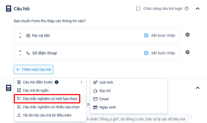Khi này, hệ thống Zalo Ads xuất hiện các nội dung câu hỏi cho phép nhà quảng cáo thêm vào form quảng cáo.