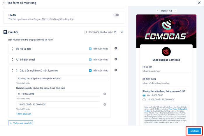 Ngoài tính năng Form tạo sẵn, Zalo Ads cho phép nhà quảng cáo tự tạo form và tùy chỉnh các trường thông tin câu hỏi để sàn lọc và phân loại khách hàng dễ dàng.